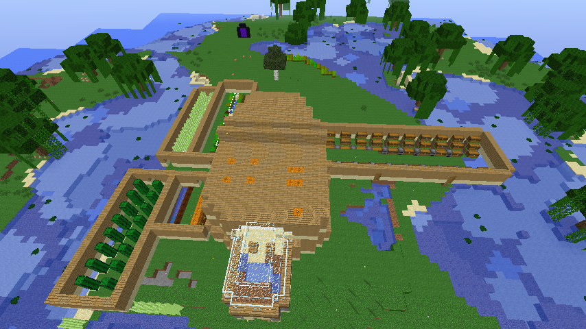 Here is a picture of my SMP base so far. You can't see them here, but there's quite the herd of cows by where the portal is resting. Bread doesn't quell the hidden hunger bar so I've been free range breeding cows a lot.